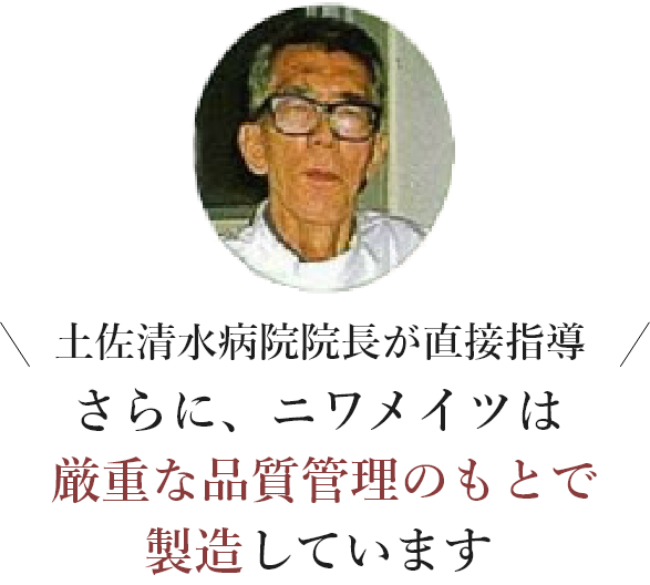 土佐清水病院院長・丹羽靭負先生の開発されたSOD作用食品には、必ず「金の笠シール(管理番号付き)」が貼ってあります。