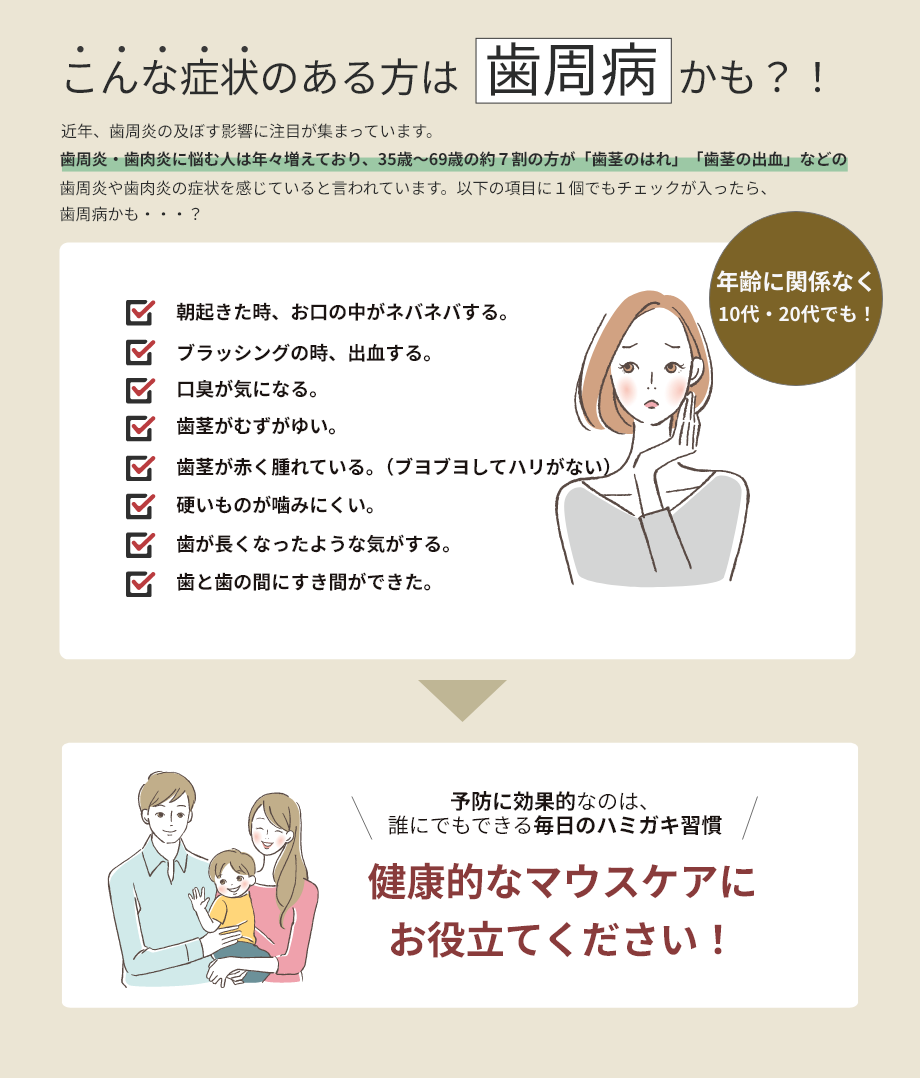 歯周病に悩む人は年々増えており、35〜69歳の約7割の方が『歯ぐきのはれ・出血』などの歯周病を感じていると言われています。