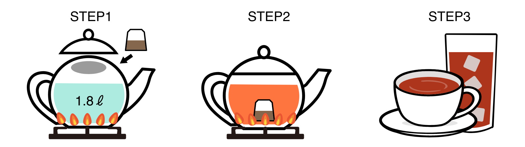 1. ティーパック1袋をやかん(約1.8リットル)の水に入れ、沸騰させてください。