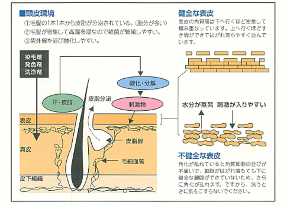 また、頭皮のトラブル”フケ”は、紫外線により発生した活性酸素が頭皮の脂を酸化して、過酸化脂質となり付着することで頭皮を乾燥させ、しいては新陳代謝を乱すことも一因です。