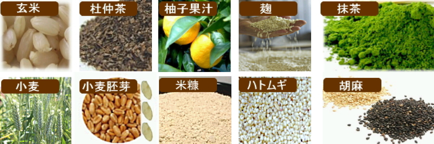 小麦、ハトムギ、胚芽、糠、ゴマ油、ゆず果汁、抹茶、杜仲茶、ごま、玄米、麹