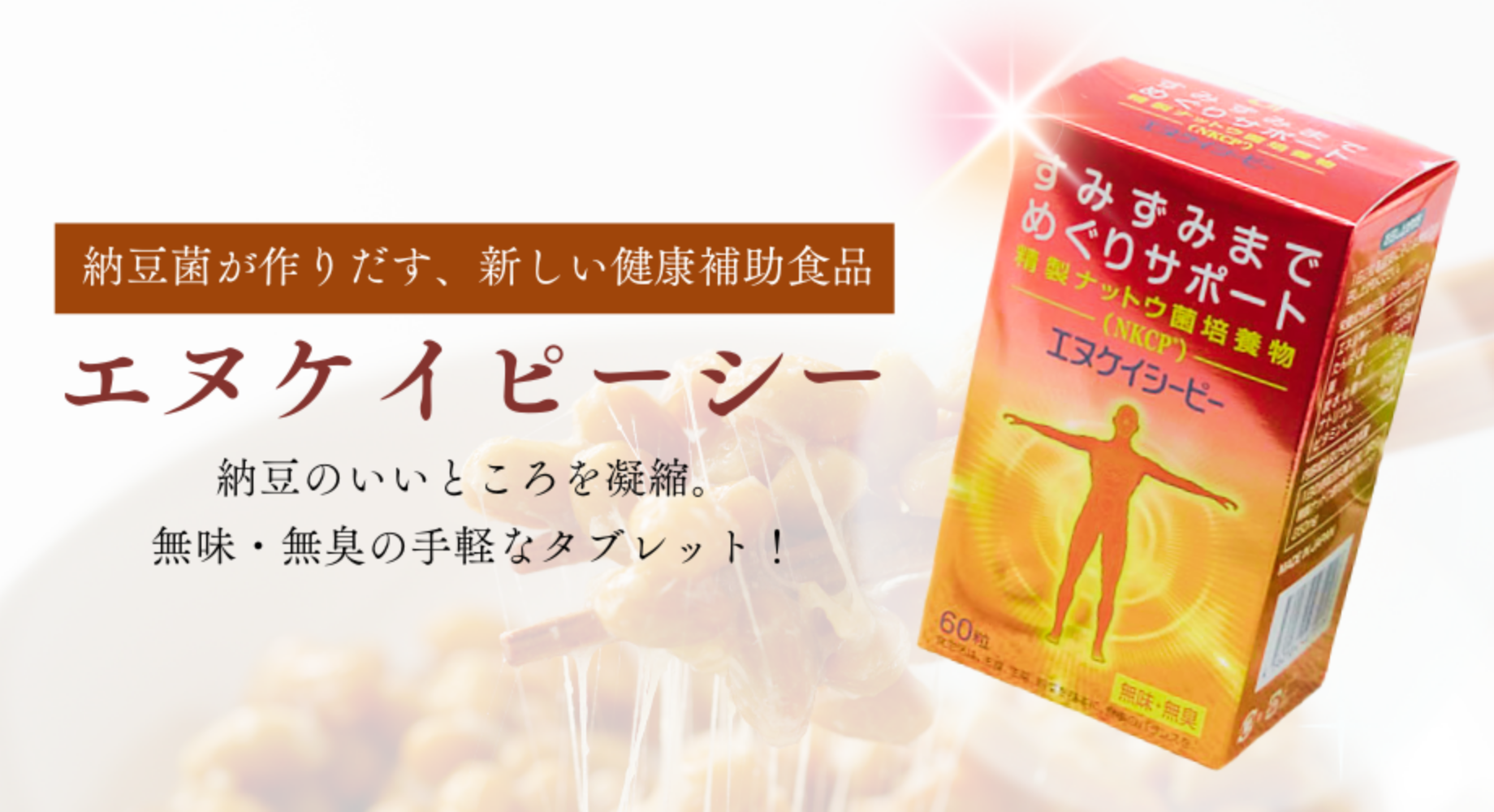 エヌケイシーピーは、ナットウ菌の培養ろ液からナットウ菌が作りだす有用成分を集めた新しい健康補助食品です。